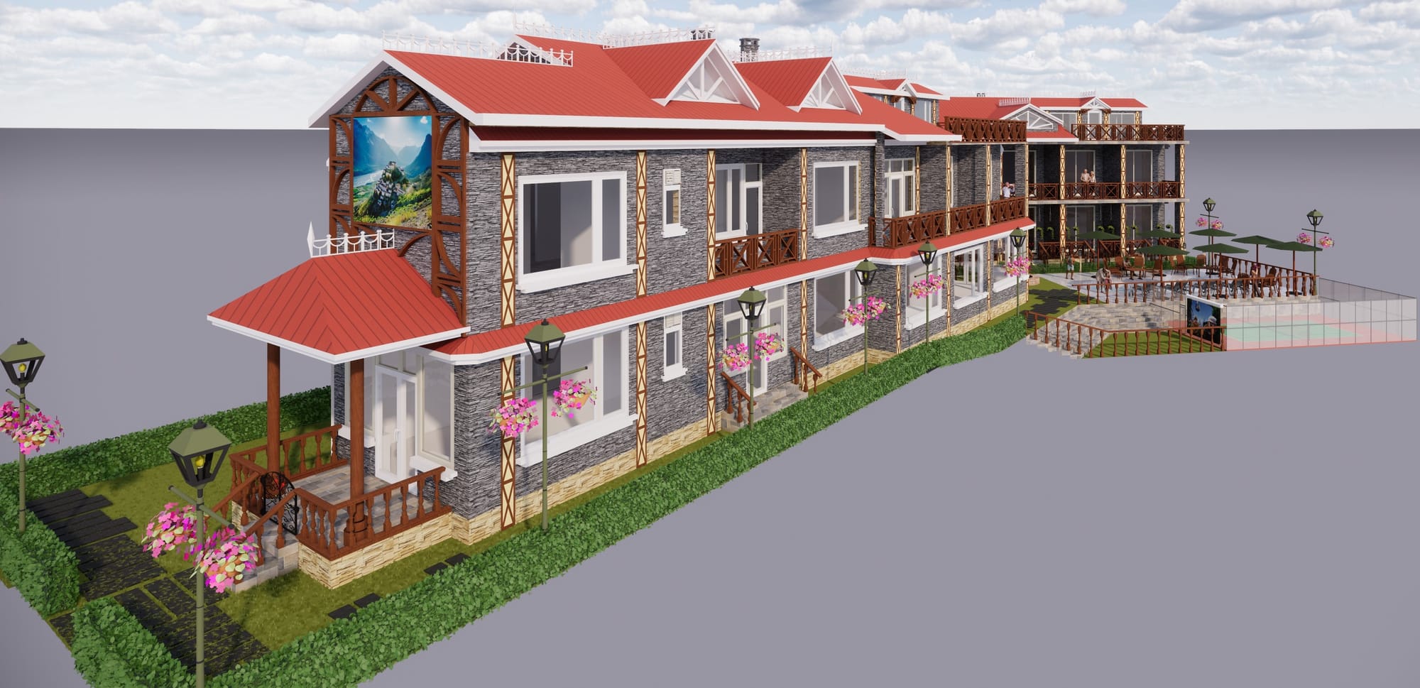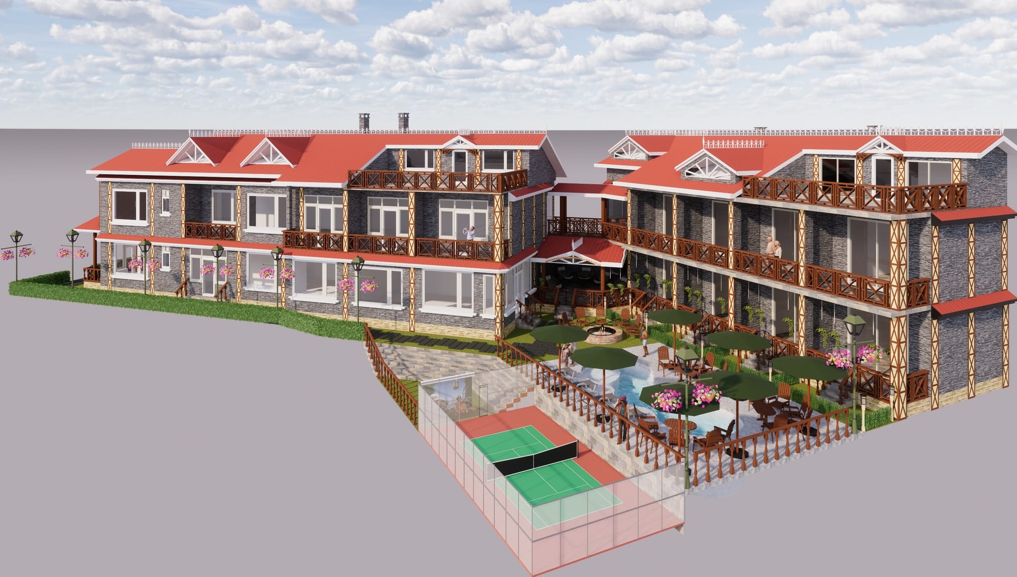 Nestled in the picturesque hills of Badai, Himachal Pradesh, Himalayan Haven B&B is a thoughtfully designed retreat that blends comfort, recreation, and natural beauty. The property features a badminton court, swimming pool, outdoor barbeque area, and an open-air poolside TV lounge, creating versatile spaces for both relaxation and active leisure. Using locally sourced materials and earthy tones, the architecture harmonizes with the surrounding mountains, offering guests a seamless connection with nature. From morning games to evening gatherings under the stars, every corner of Himalayan Haven is crafted to provide a serene, immersive, and memorable hill-station experience.